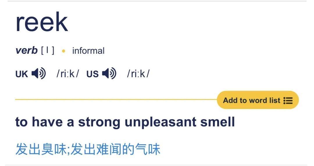最初在古英语里,reek主要指烟雾、蒸汽或水汽。这与人类早期的生活场景,比如生火、取暖时产生的烟气密切相关。由于燃烧物产生的烟常常伴随着难闻的气味,reek逐渐就与令人不快的联想联系在了一起。